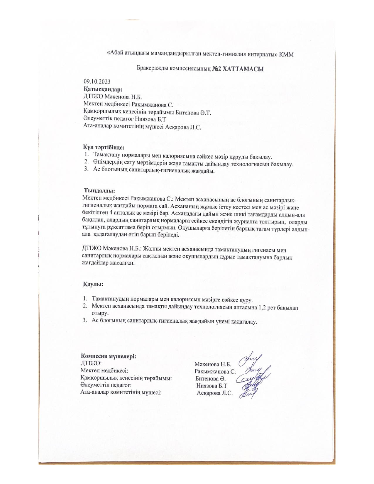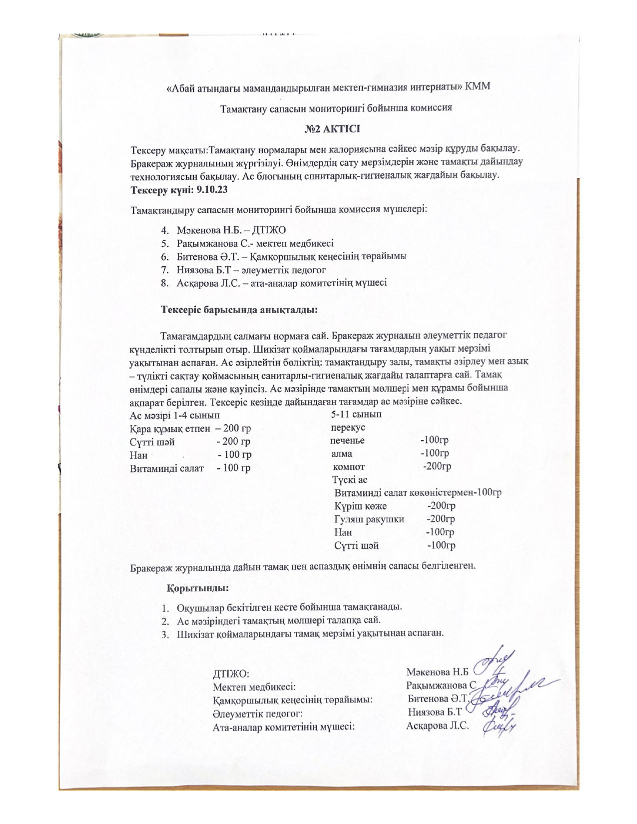 Тамақтану сапасының мониторингі » «Абай атындағы мамандандырылған мектеп-гимназия интернаты»