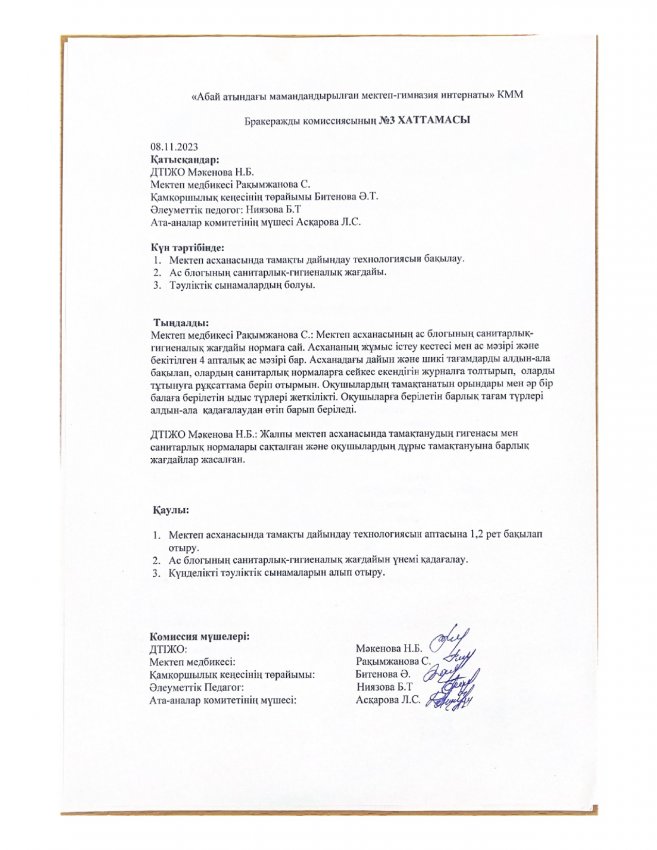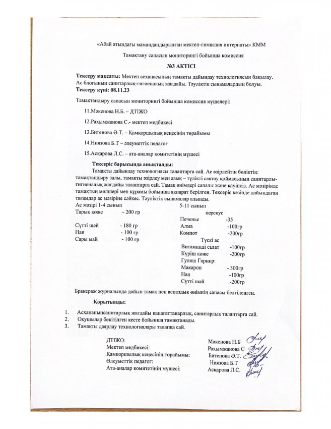 Тамақтану сапасының мониторингі » «Абай атындағы мамандандырылған мектеп-гимназия интернаты»