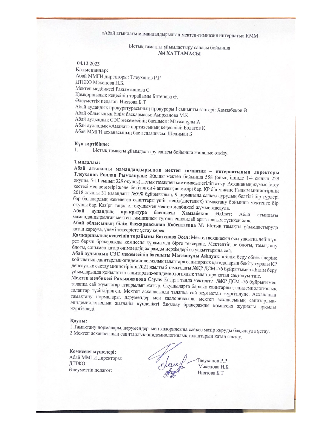 Ыстық тамақты ұйымдастыру бойынша жиналыс » «Абай атындағы мамандандырылған мектеп-гимназия интернаты»