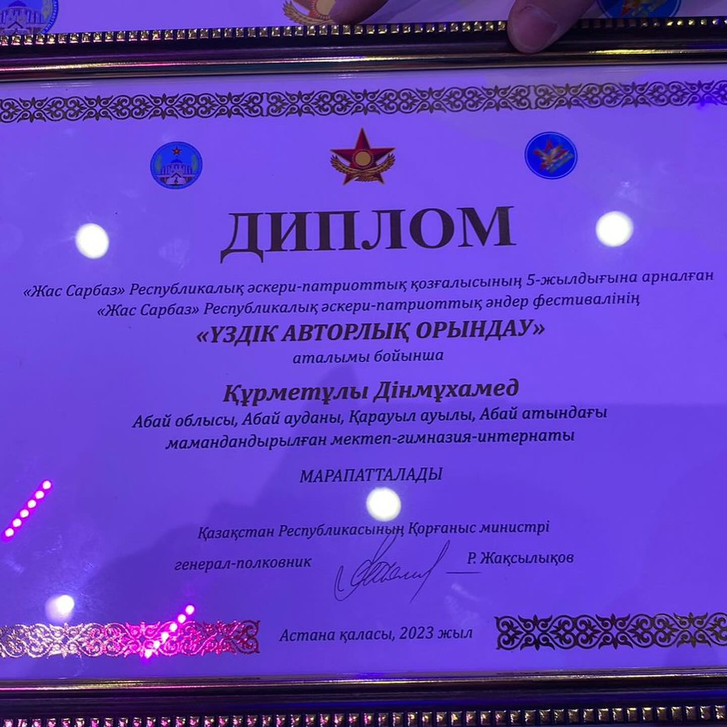 🔶Республикалық «Жас сарбаз» әскери-патриоттық әндер фестивальінің қортындысы бойынша 31 орындаушылардың ішінен Құрметұлы Дінмұхамед🏆 «Үздік авторлық орындау» аталымы және телевизор сыйлығымен марапатталды.