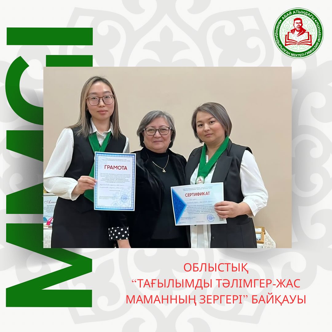 🔰Облыстық байқауға мектебімізден орыс тілі мен әдебиеті пәнінің мұғалімдері АЛДАЖАРОВА МАДИНА мен ҚҰРМАНБАЕВА АРУЖАН қатысып, “Үздік портфолио” номинациясымен марапатталды.