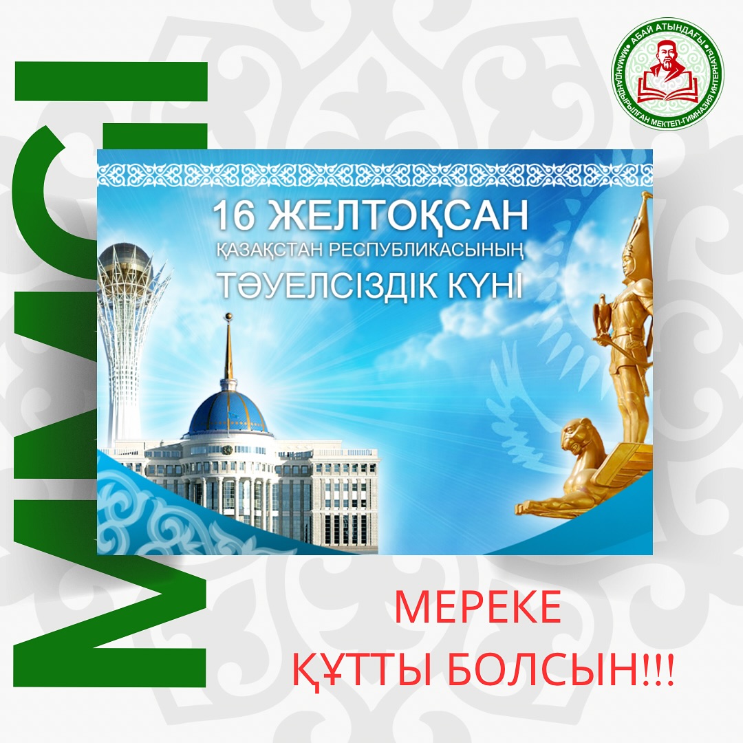 “АБАЙ АТЫНДАҒЫ МАМАНДАНДЫРЫЛҒАН МЕКТЕП-ГИМНАЗИЯ ИНТЕРНАТЫ”КММнің директоры Роллан Рымханұлы Тлеухановтың құттықтауы Сіздерді ұлық мереке – Қазақстан Тәуелсіздігі күні мерекесімен шын жүректен құттықтаймын!