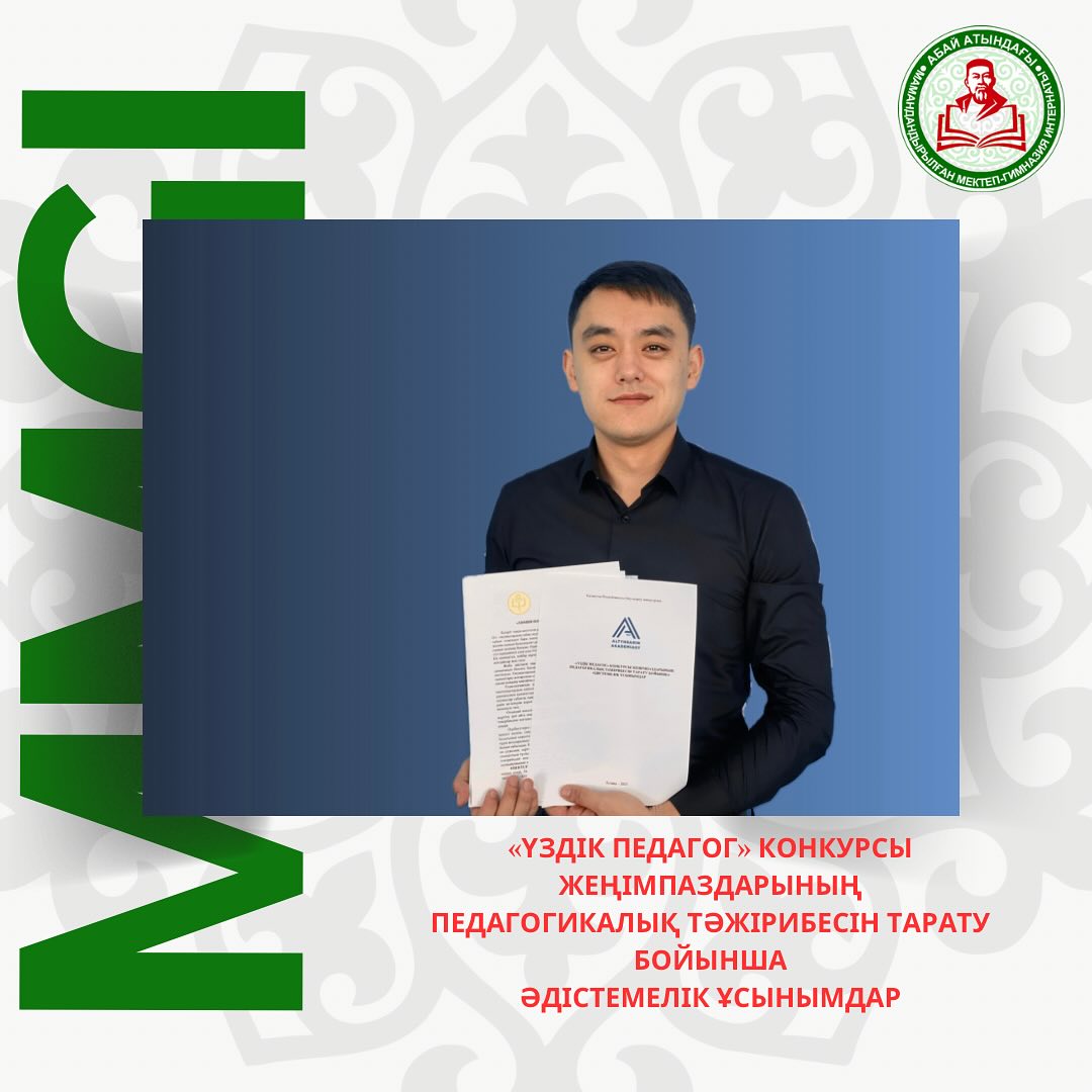 🔰2024 жылдың 26 қаңтар күні ҚР Оқу-ағарту министрлігінің Ы.Алтынсарин атындағы Ұлттық білім академиясының ұйымдастыруымен «Үздік педагог» конкурсы жеңімпаздарының педагогикалық тәжірибесін тарату мақсатында әдістемелік ұсынымдар жарияланды.🔰Бұл әдістемелік ұсынымда «Үздік педагог» конкурсында үздік атанған мұғалімдер өздерінің озық іс-тәжірибелерімен бөлісті.