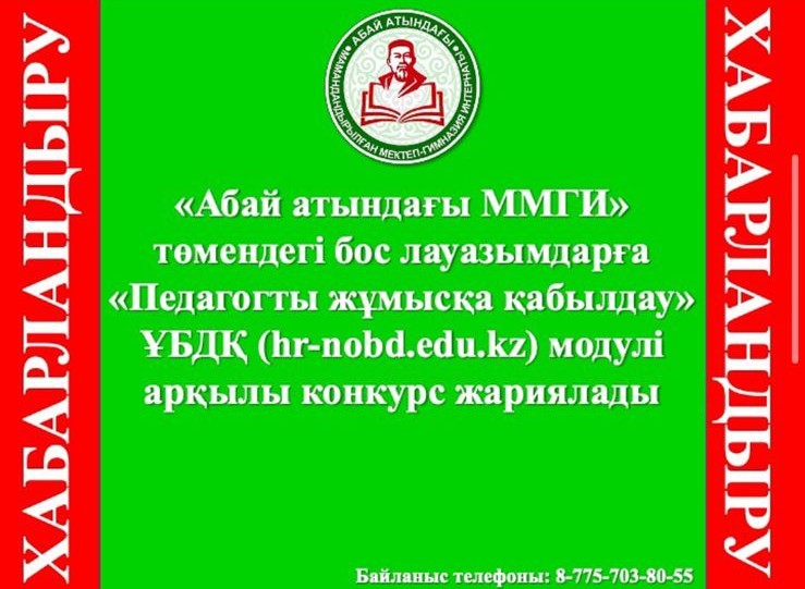 “Абай атындағы ММГИ” төмендегі бос лауазымдарға «Педагогты жұмысқа қабылдау» ҰБДҚ (hr-nobd.edu.kz) модулі арқылы конкурс жариялады:Педагог-психолог – 1 толық жүктеме тұрақты орын.
