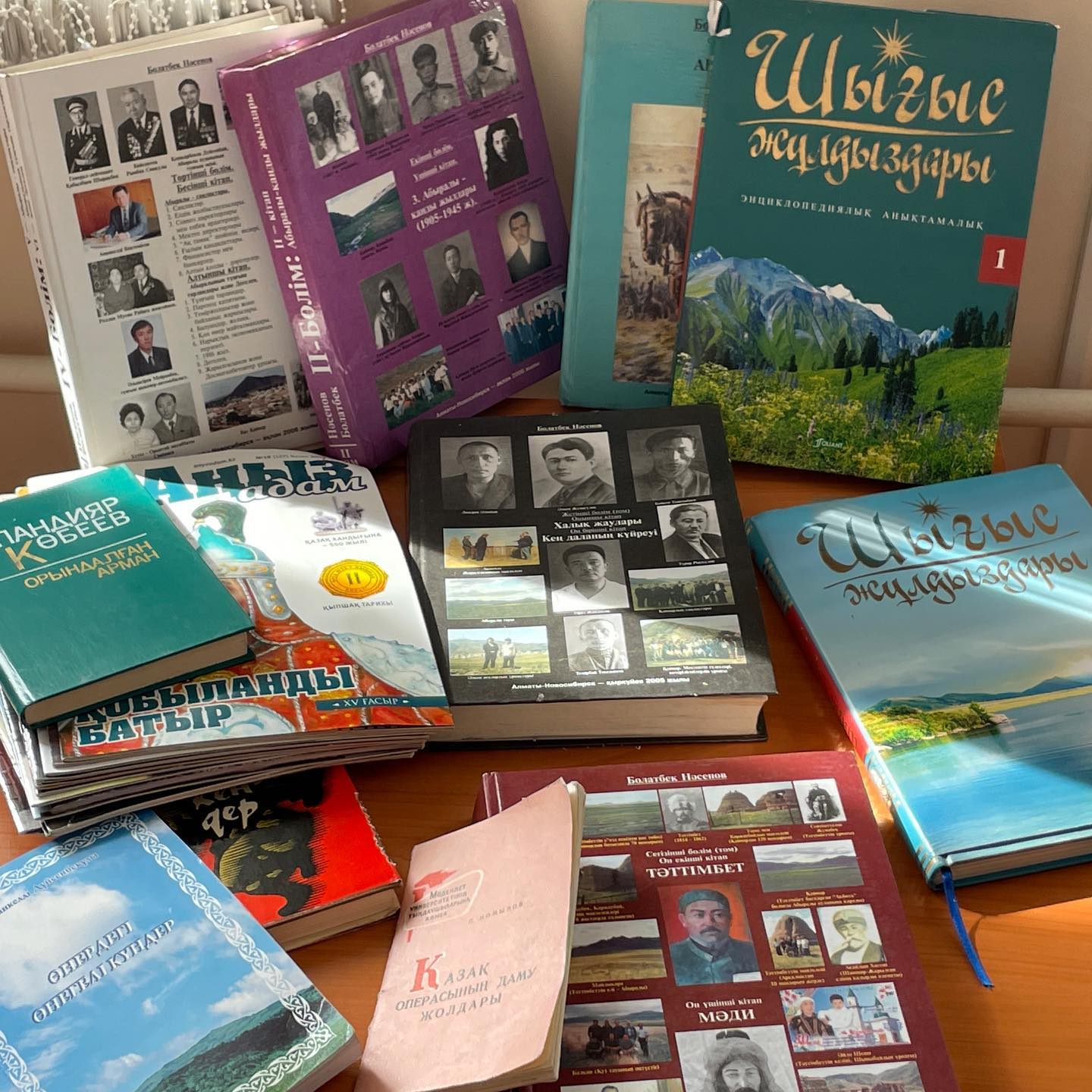 📚Бұл кітаптардың ішінде "Абралы-Қанды жылдары" атты аннотация томдары, "Шығыс жұлдыздары" энциклопедиялық анықтамалар, Ш.Айтматов " Боранды бекет" романы, Ф.Онғарсынова, Ж.Карменовтың шығармалары және де "Аңыз адам " журналының топтамасы да бар.