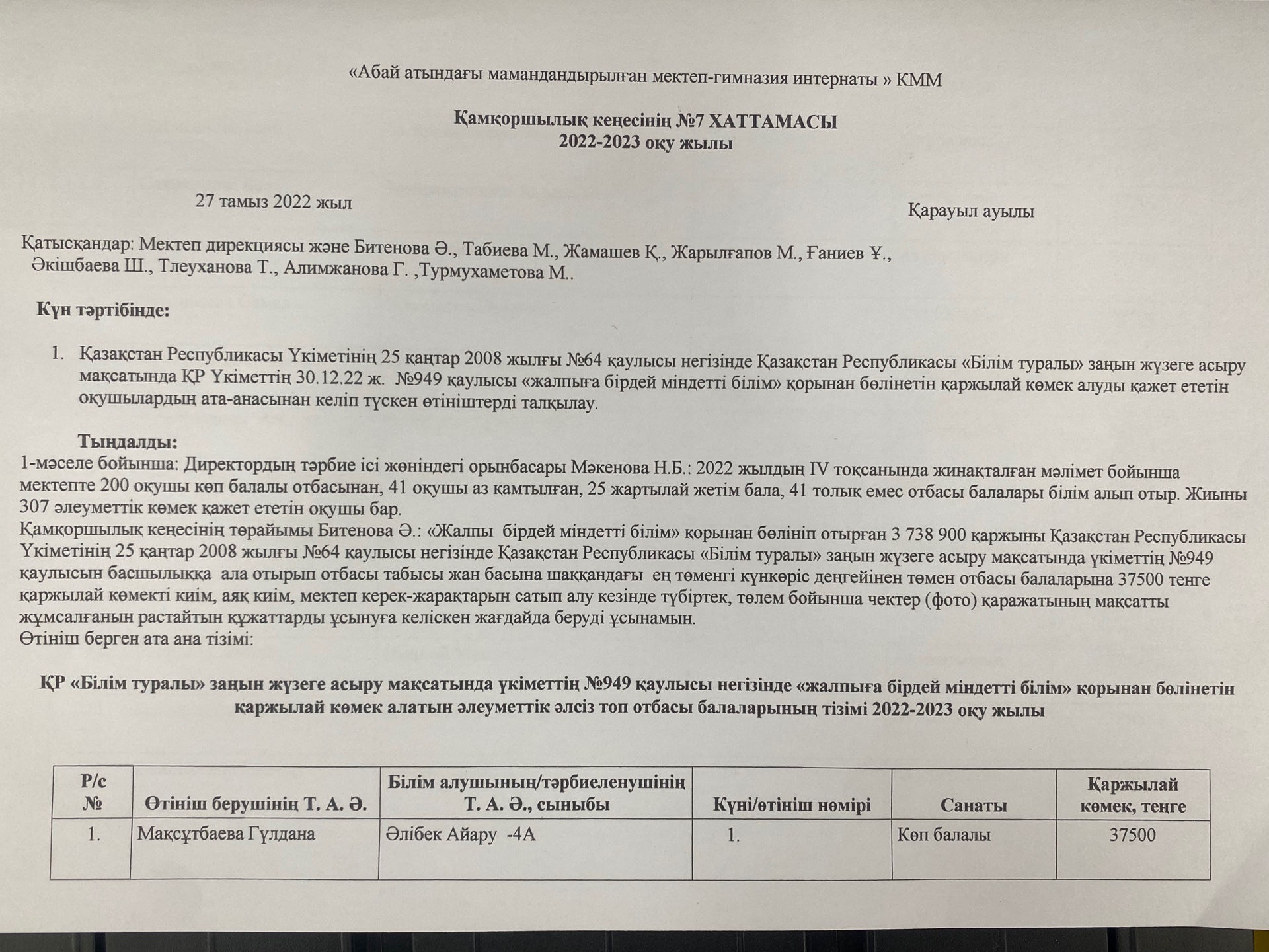 Қамқоршылық кеңесінің №7 ХАТТАМАСЫ 2022-2023 оқу жылы » «Абай атындағы мамандандырылған мектеп-гимназия интернаты»