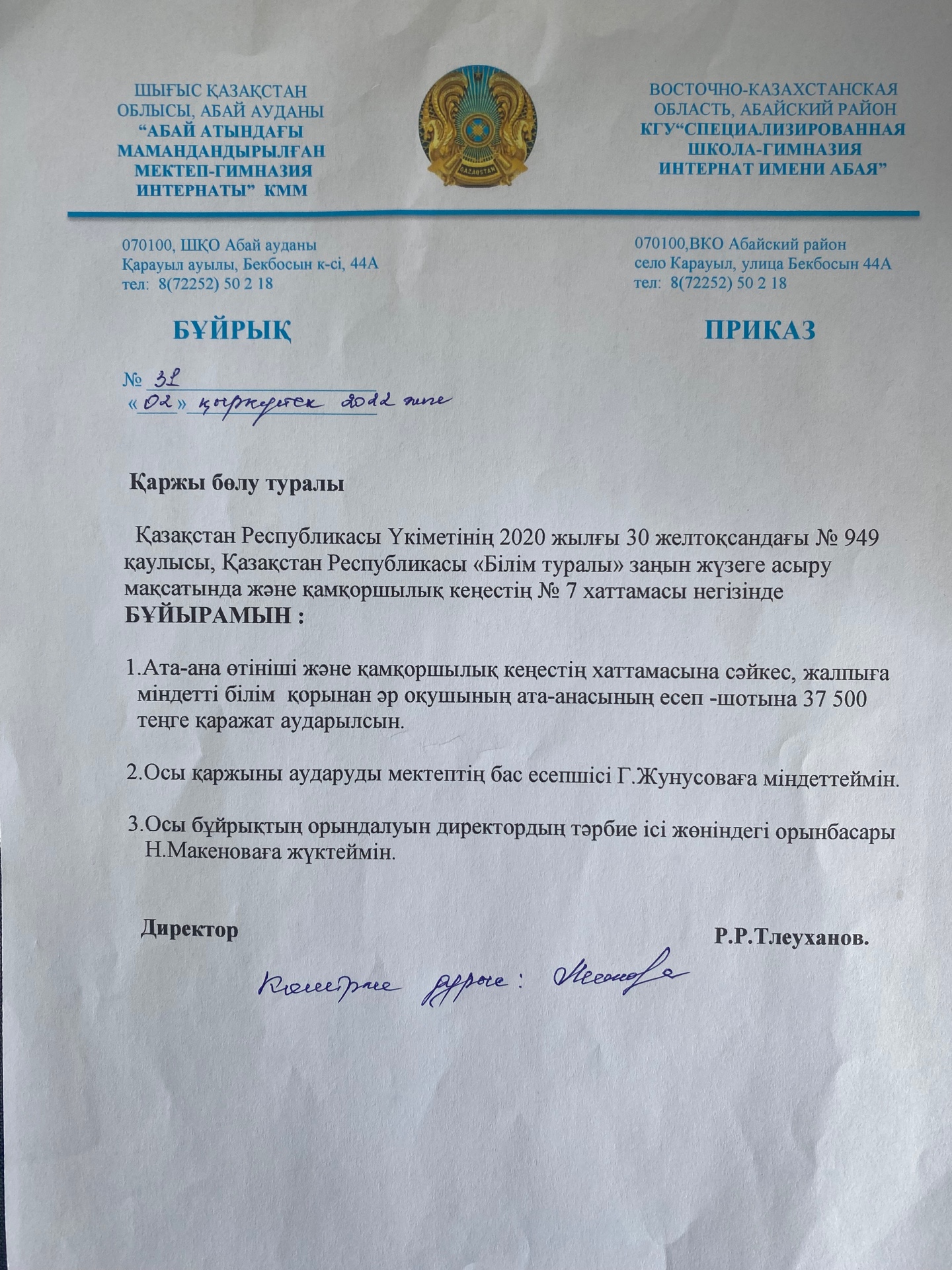 Қаржы бөлу туралы бұйрық » «Абай атындағы мамандандырылған мектеп-гимназия интернаты»