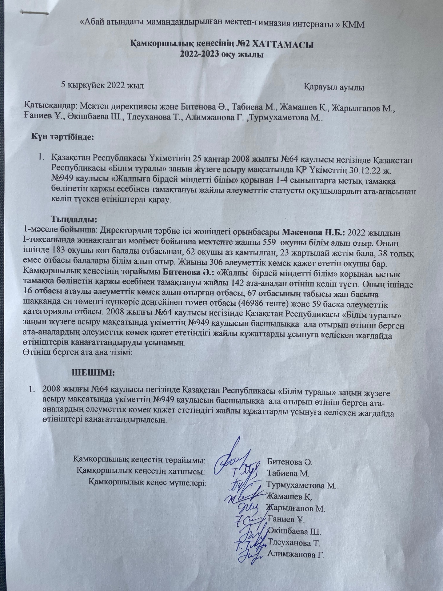 Қамқоршылық кеңес отырысының №2 хаттамасы » «Абай атындағы мамандандырылған мектеп-гимназия интернаты»